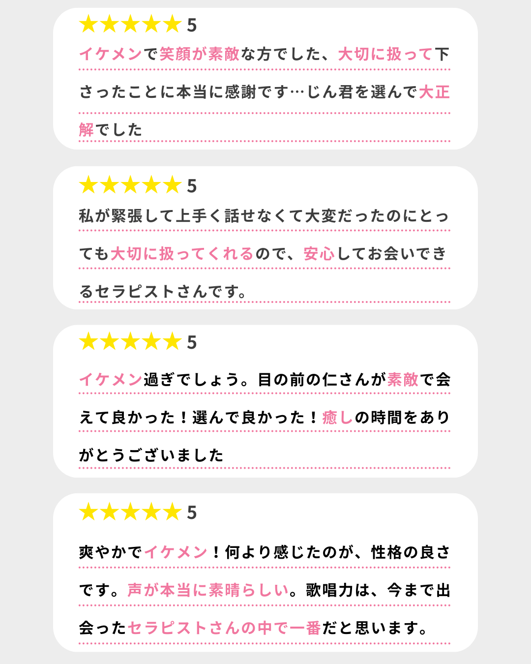 もともとイキにくい体質の私が、まさかの脳イキ体験ができたことが今でも信じられません。詳しい内容は書けませんが、沢山感じて溢れてしまい、外イキ、中イキは勿論!最後は脳イキのENDLESSで大変なことに...施術の上手さも大事だとは思いますが、誰とするかが大事なんだと改めて感じました!寒くないように、布団かけてくれたり、カイロで温めてくれたり、心遣いも嬉しかったです♡また個人的には前より後ろからが好きなのでバックハグが良かったです💕施術だけじゃなくてトークの時間も作って下さるので、恋人気分も味わえるし、心地良い時間を過ごすことができて大満足です✨トップを目指せるセラピストさんだと思うので、これからも推させて下さい🎀♩応援しています